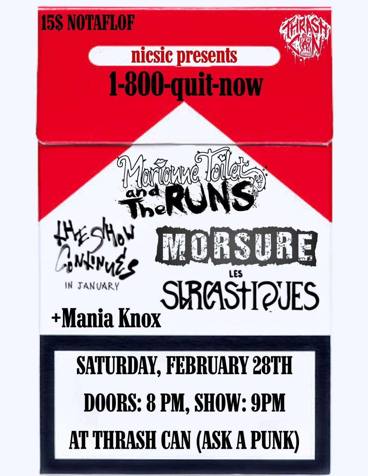 1-800-QUIT NOW avec Marianne Toilet and the Runs + Les Sarcastiques + The Show Continues (in January) + Morsure + Mania Knox