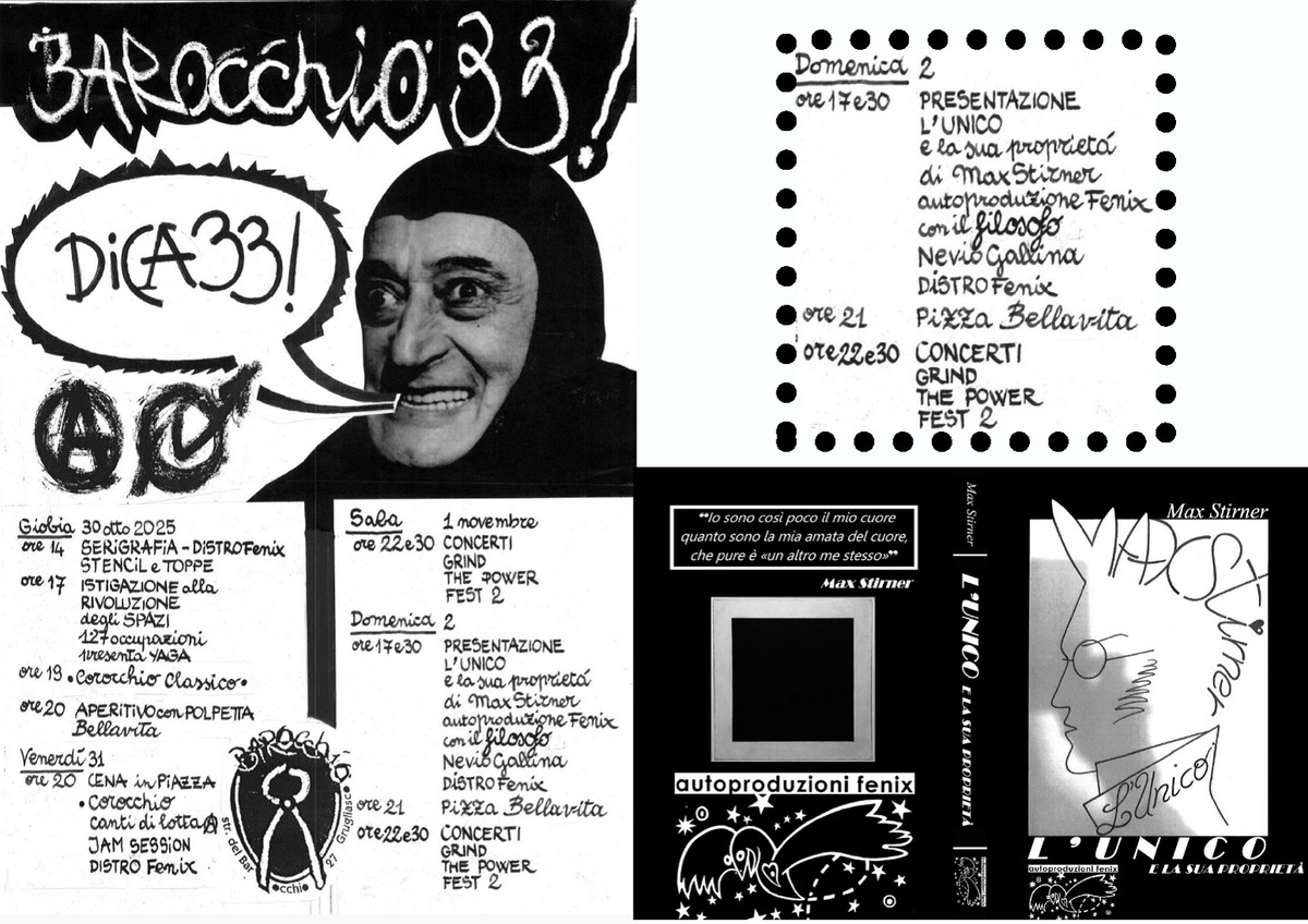 33 ANNI DI OCCUPAZIONE BAROCCHIO SQUAT - domenica 02.11.2025 - PRESENTAZIONE della PRIMA autoproduzione FENIX de L'UNICO E LA SUA PROPRIETร di Max Stirner - distro Fenix - pizza BELLAVITA e CONCERTI