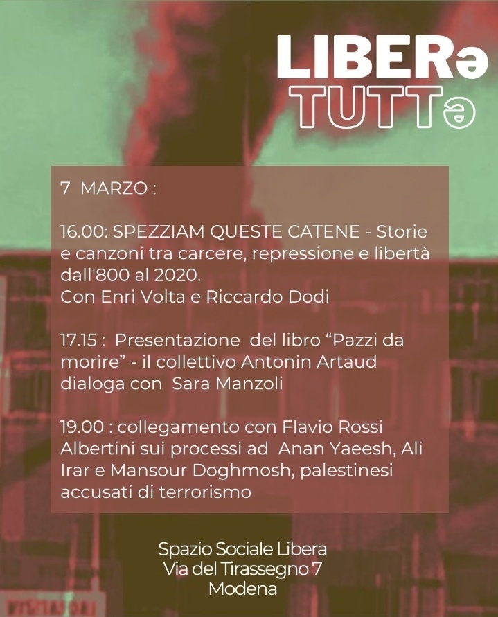 musicaPalestinalibricarcereantipsichiatriacollettivo antipsichiatrico Antonin ArtaudComitato verità e giustizia per i morti de Sant'AnnadibattitoliberaLiberx tuttxlotta anticarcerariapsichiatria