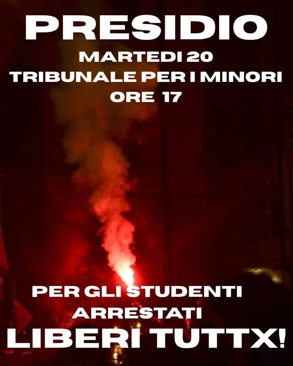 Ricordiamo che gli/le student3 sono stati messi agli arresti domiciliari il 30 dicembre e, successivamente agli interrogatori del GIP avvenuti l'8 gennaio, รจ stato prescritto che possono andare esclusivamente a scuola o a visite mediche, accompagnati (scortati) da un adulto.