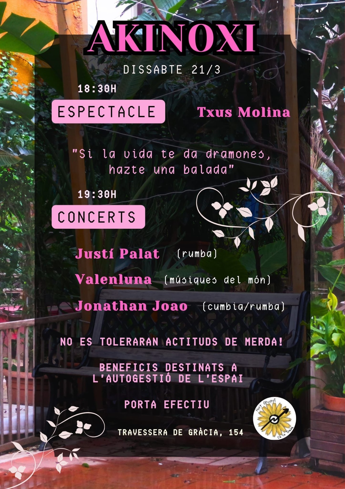El dissabte 21 de Març donem la benvinguda a la Primavera, començarem amb un espectacle i seguirem amb una mica de música per anar escalfant el cos pels pròxims mesos!
