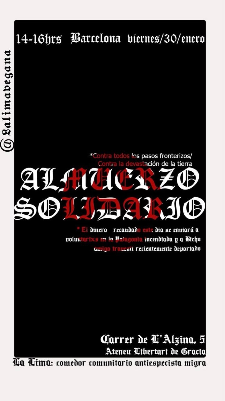 Desde la La Lima: Comedor comunitario Antiespecistasta, Antiracista y Transfeminista, les invitamos a este almuerzo en solidaridad con brigadistas que trabajan apagando los fuegos provocados en la Patagonia y con Bicho, compañero trans masculino que recientemente fue aprisionado en el aeropuerto Jorge Newbery (CABA) y posteriormente deportado a Brazil.