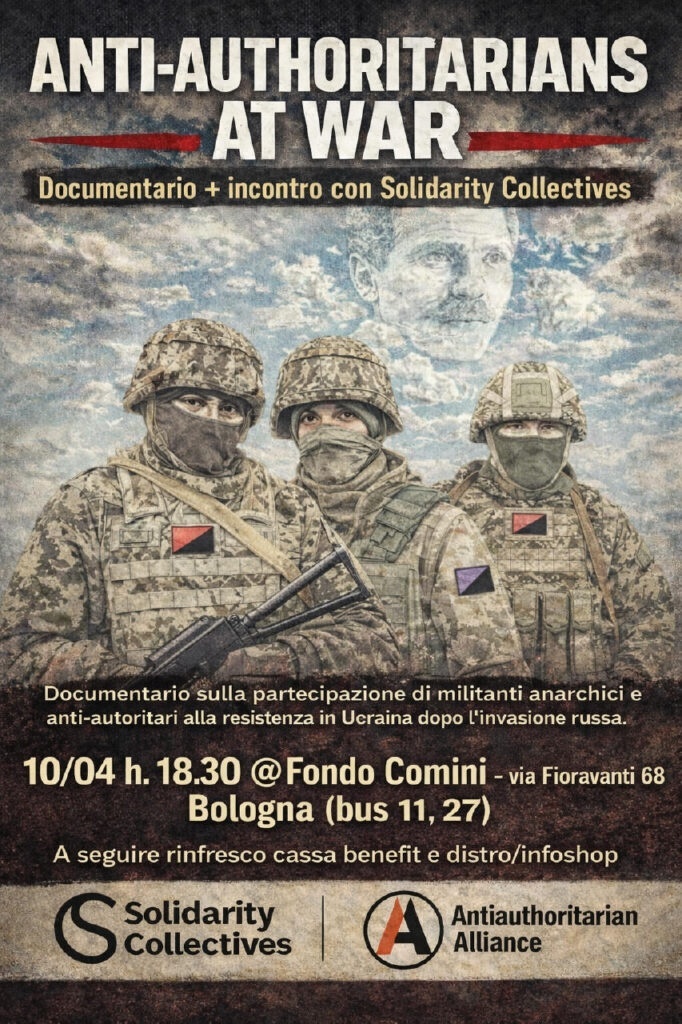Anti-Authoritarians at War racconta la partecipazione di militanti anarchici e anti-autoritari alla resistenza in Ucraina dopo l’invasione russa. Il documentario segue l’esperienza di combattenti e volontari che hanno scelto di organizzarsi in modo autonomo e solidale, mostrando sia la dimensione militare sia quella politica e mutualistica della resistenza. Dopo la proiezione ci sarà un dibattito con una compagna di Solidarity Collectives, rete impegnata nel sostegno ai combattenti e alle iniziative solidali sul campo.