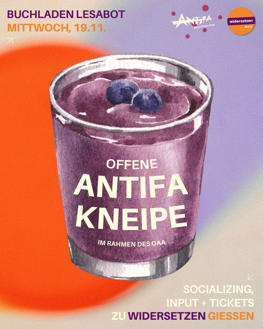 🍹 Bei selbstgemachten Cocktails, Bier und alkoholfreien Getränken lauschen wir einem kurzen Input von @widersetzen_bonn zu den Aktionen gegen die Neugründung der AfD-Jugend in Gießen und Infos über zentrale Akteure in der zukünftigen Parteijugend.