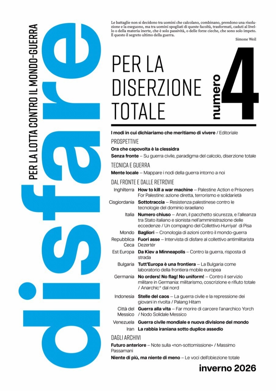 Disponibile il quarto numero di “disfare – per la lotta contro il mondo-guerra”, inverno 2026.