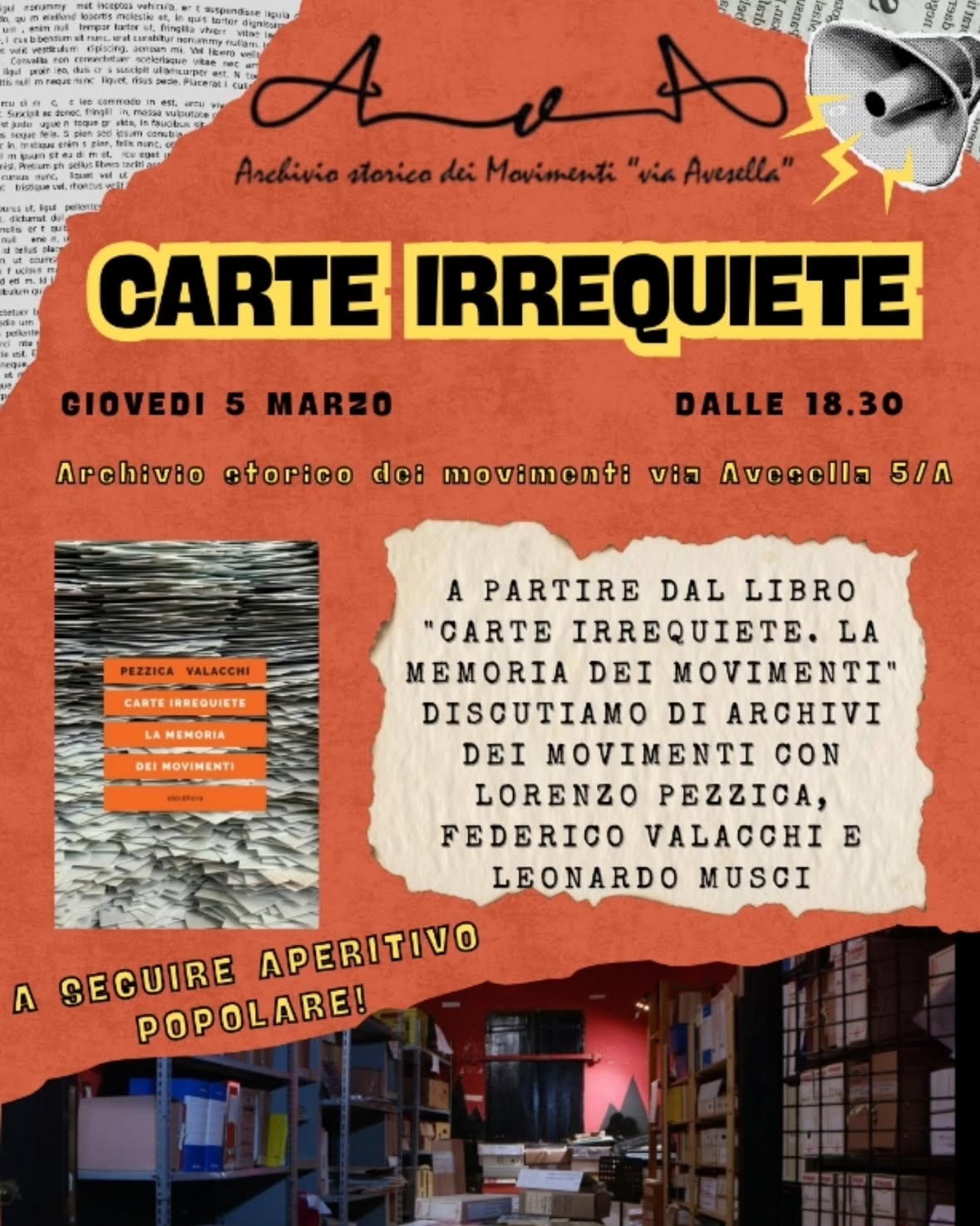 A partire dal libro "Carte irrequiete. La memoria dei movimenti" discutiamo di Archivi dei movimenti, di 'attivismo archivistico' e pratiche partecipative insieme agli archivisti Lorenzo Pezzica e Federico Valacchi (autori del volume) e Leonardo Musci (autore della prefazione).