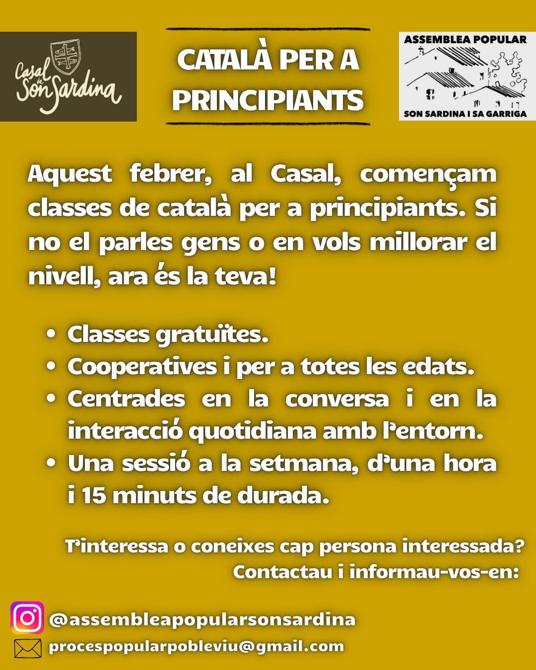 A partir del febrer, des de l'Assemblea Popular impulsam classes de català per a principiants al Casal de Son Sardina: una sessió a la setmana (dia per definir), una hora i quart, gratuïta i centrada en la conversa. Vols aprendre nocions bàsiques o millorar la interacció? Tens un bon nivell i vols ensenyar als altres? És la teva! Contacta'ns per instagram o al correu.