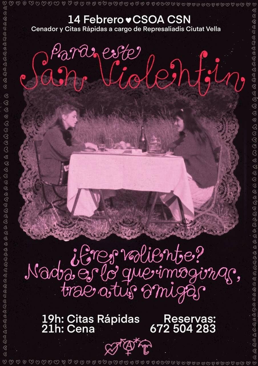 CENADOR Y CITAS RAPIDAS EL 14 DE FEBREO EN EL CSN a cargo de Represaliadis Ciutat Vella Vente a pasar una gran velada en el día de San Violentin al CSN! Para combatir la violencia del Estado, arrejuntate!