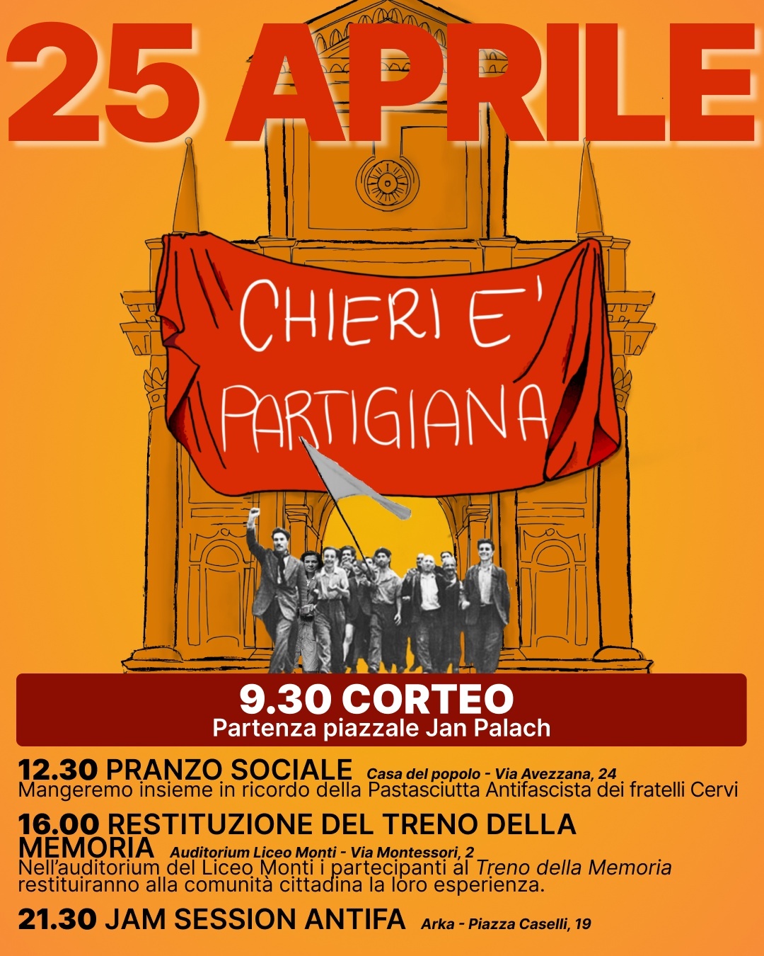 • Ore 12.30 PRANZO SOCIALE, Pastasciutta antifascista dei fratelli Cervi, a seguire cantiamo insieme la Resistenza