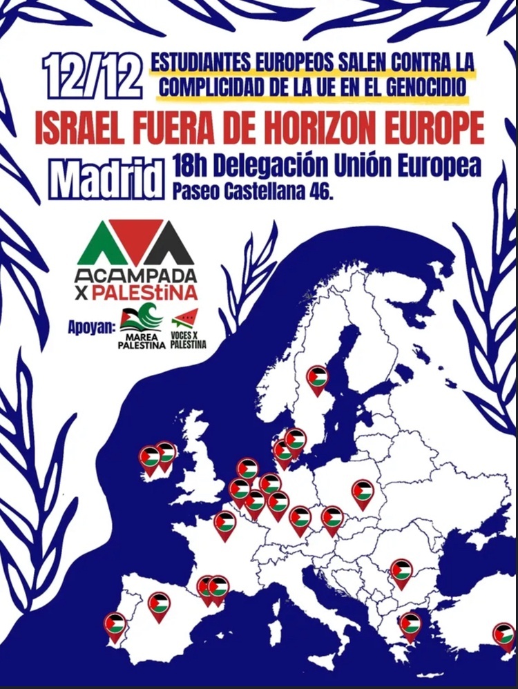 3️⃣ Viernes 12 (18h): Concentración en la Delegación de la Unión Europea en Madrid junto a 20+ otros países. ¡Fin al financiamiento del estado genocida! ¡Israel fuera de Horizon!