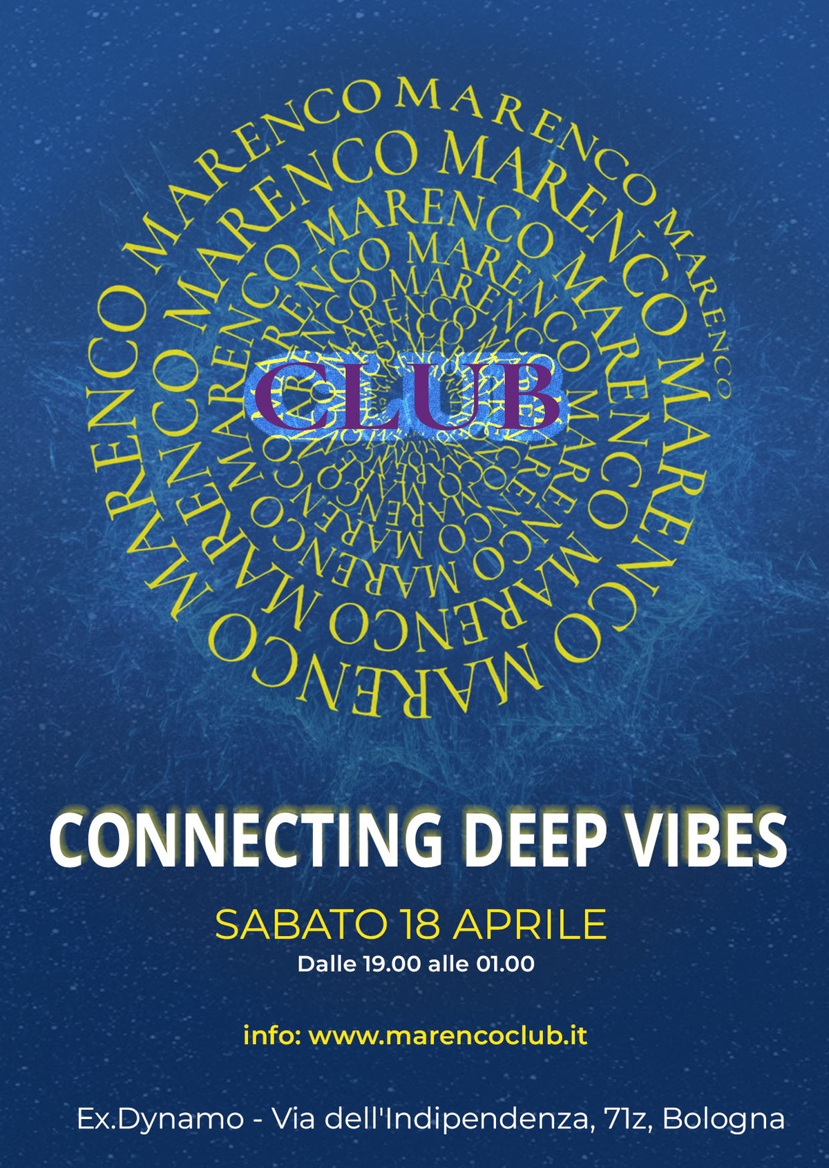 Bologna, 18 aprile 2026 — Sabato 18 aprile, gli spazi di ExDynamo ospitano Connecting Deep Vibes, nuovo appuntamento firmato Marenco Club che unisce musica elettronica, visual art e installazioni luminose.