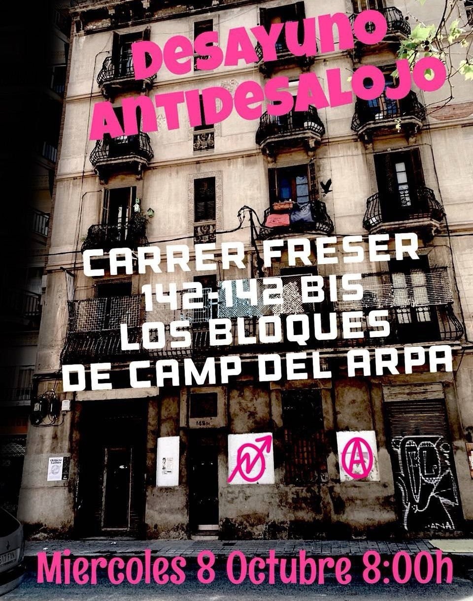El día 📆 8 de octubre a las ⏰ 8:00 os convocamos a todes al desayuno antidesalojo de los bloques de Camp de l'arpa en Carrer del Freser 142 y 142bis.