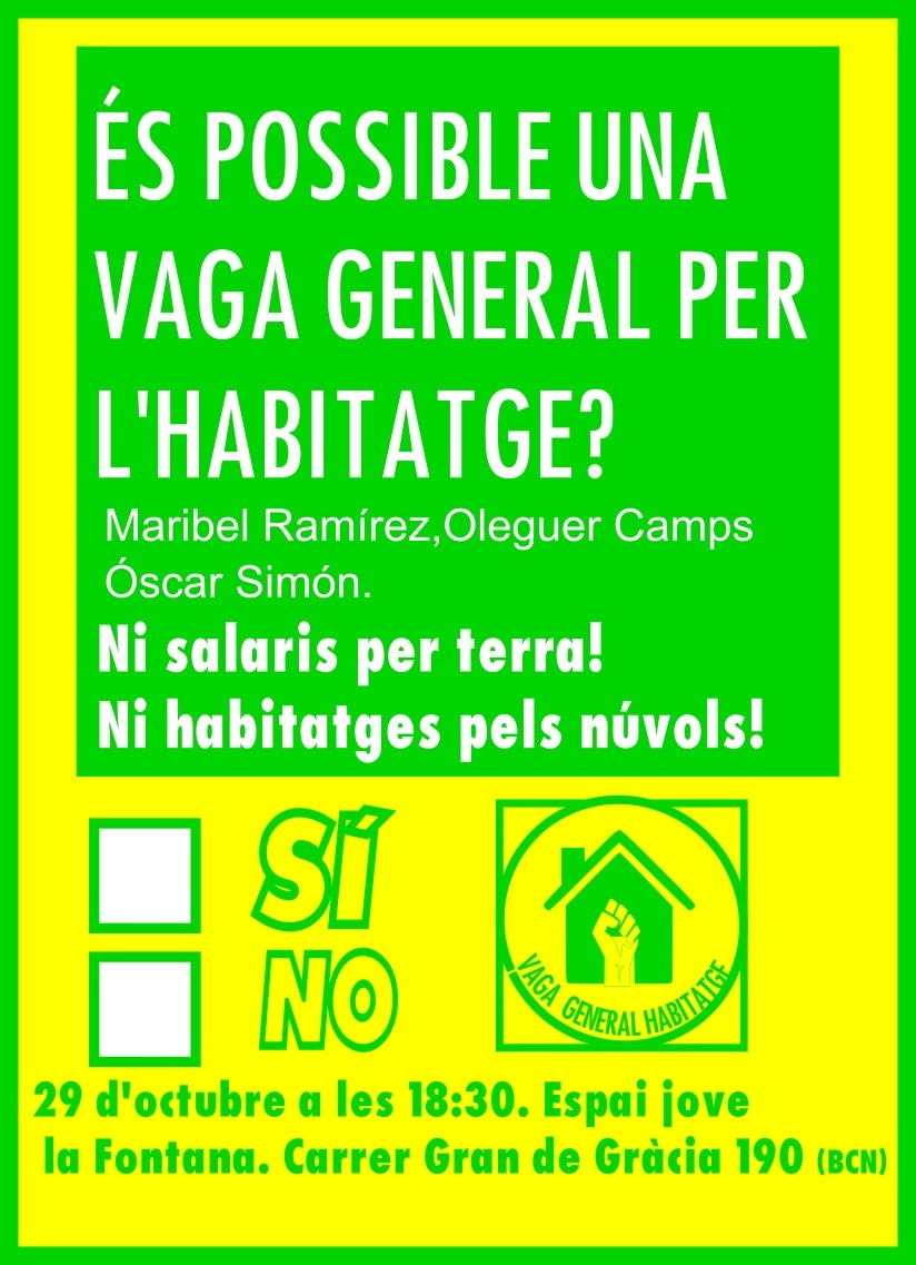Moviment per l'habitatge i sindicats laborals combatius volem obrir el debat: i si fèssim una vaga general pel preu de l'habitatge que ens menja els nostres salaris? Si el cost de la vida no para de pujar i els slris s'estnuen, no huriem d'actuar com a classe en comptes de sector a sector?