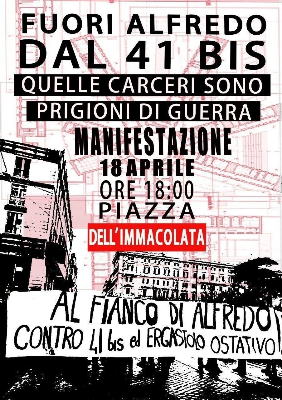 Il 10 aprile assemblea pubblica a Roma. Il 18 aprile saremo in strada a Roma per Alfredo. Quelle carceri sono delle prigioni Fuori Alfredo dal 41bis Libertà per tutti e tutte