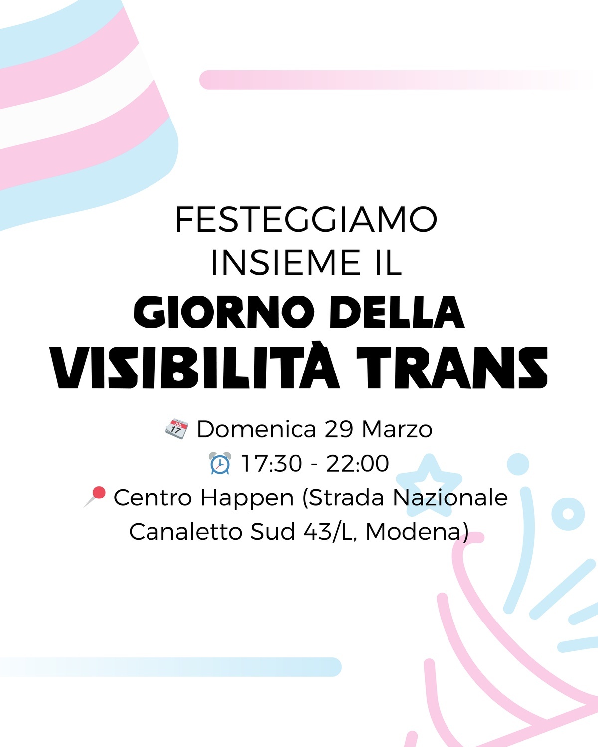 Lə Collettivə RestarT* di Modena e Reggio Emilia ti invita a festeggiare insieme in occasione del Giorno della Visibilità Trans* con una serata di condivisione di esperienze, cibo e calore umano.