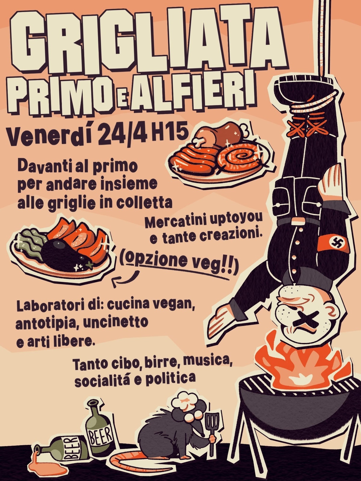 Troveremo tanto cibo (opzione vegana!) a offerta libera, a partire da 3\4 danari, birra, musica socialità e politica!