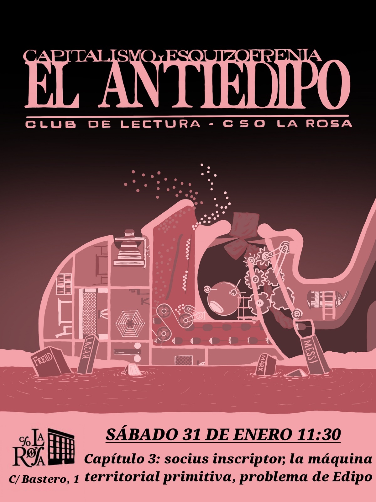 Grupo de lectura de El Antiedipo de Gilles Deleuze y Félix Guattari. En la séptima sesión trabajaremos los tres primeros epígrafes del capítulo 3: socius inscriptor, la máquina territorial primitiva, problema de Edipo (hasta la página 173 en la edición de Paidós).