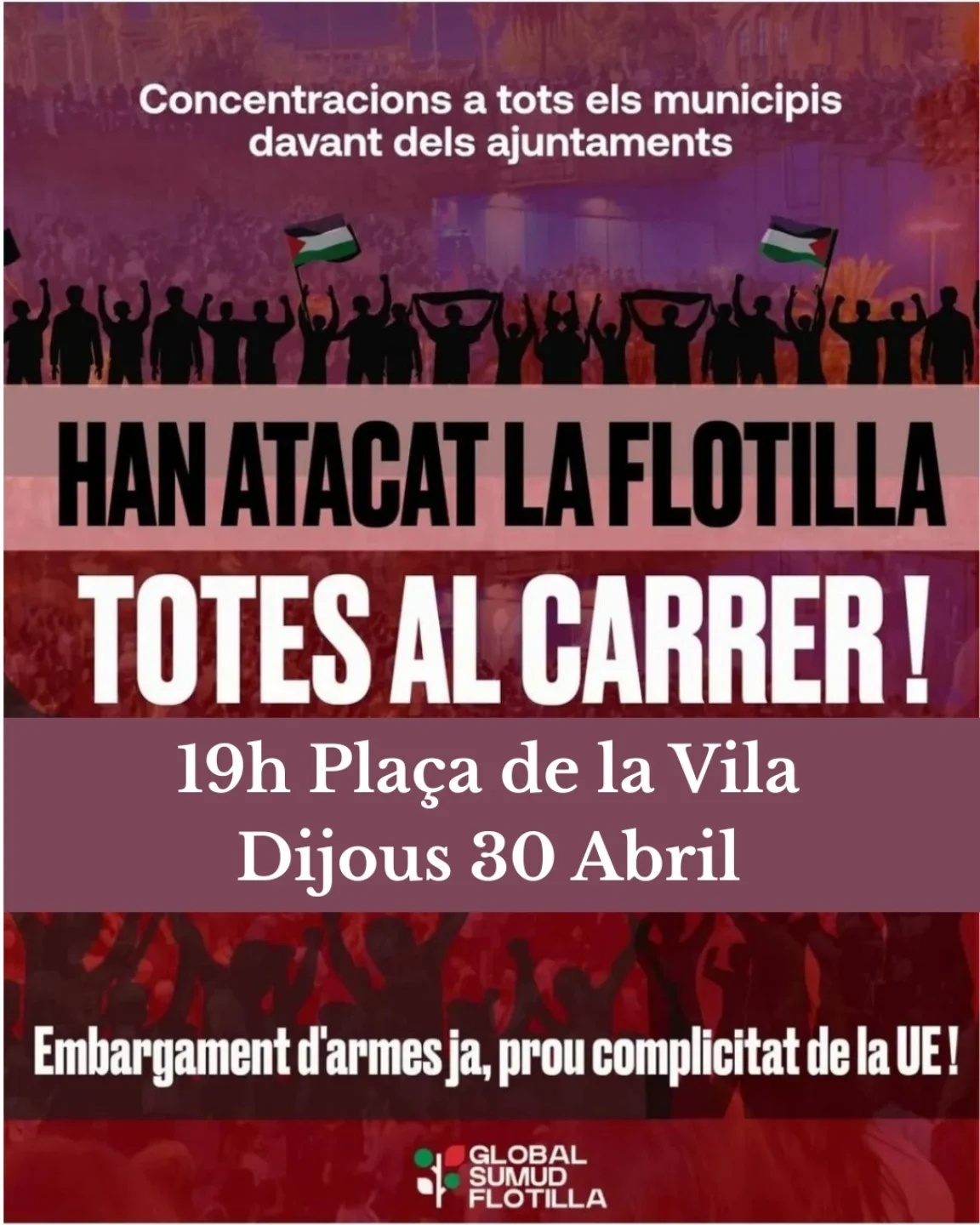 🇵🇸 Davant l'atac a la flotilla, ens sumem a la convocatòria de la Global Sumud Flotilla. Avui totes a la Plaça de la Vila a les 19h!