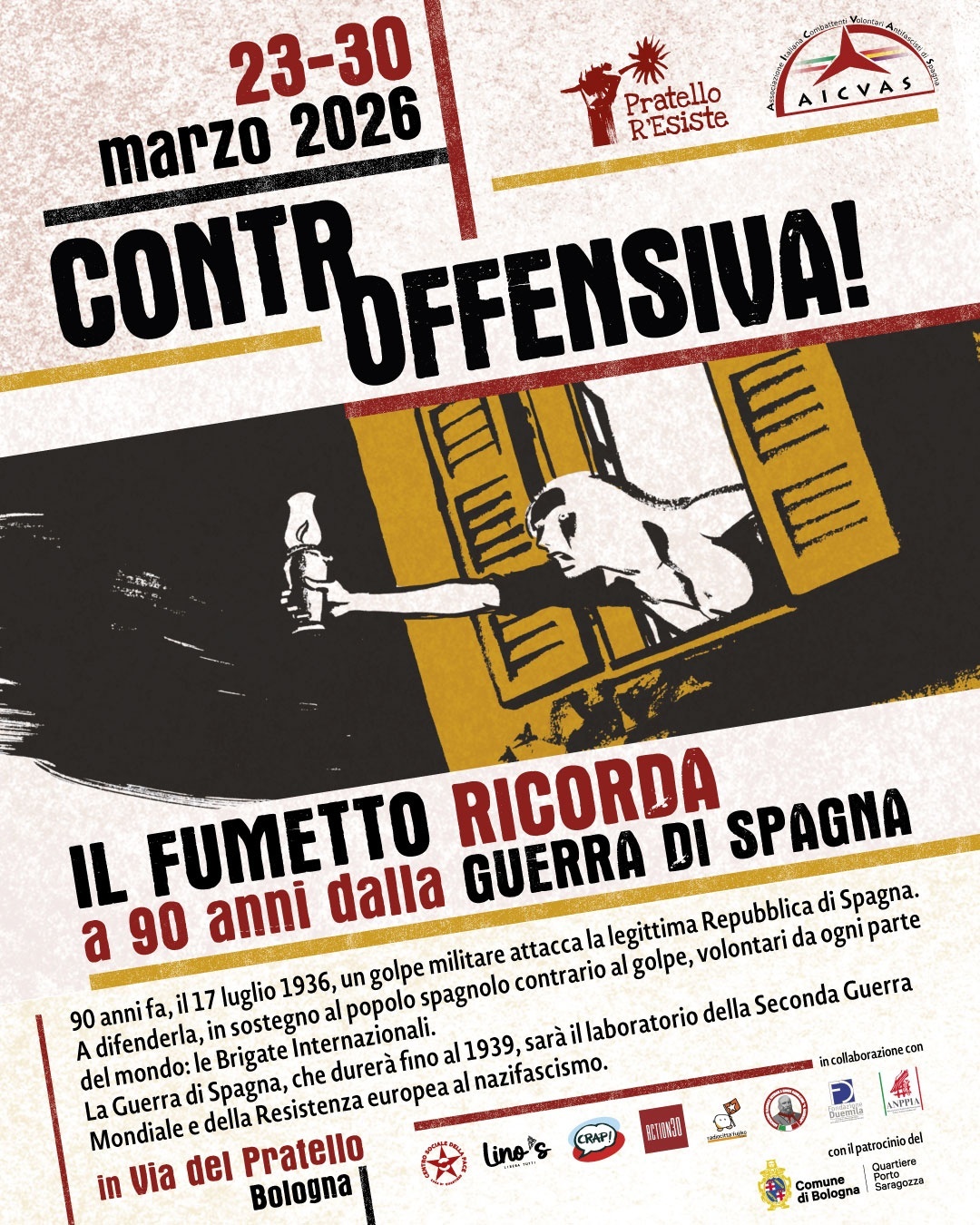 Dal 23 al 30 Marzo il Pratello si veste dei fumetti che ricordano la Guerra di Spagna: disegni, tratti dalle opere dei 4 autori invitati Canottiere, Giardino, Palumbo e Stassi verranno esposti nelle bacheche pubbliche, nelle vetrine dei negozi aderenti, alle finestre e tra le case di via del Pratello.