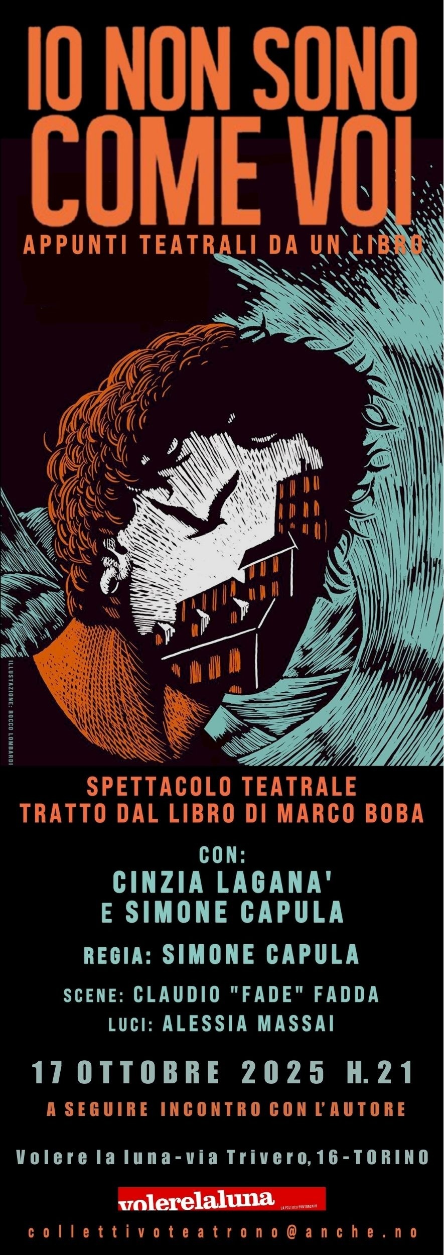 SPETTACOLO TEATRALE Io non sono come voi - Appunti teatrali da un libro di Marco Boba è stato composto in più tappe dal 2021 al 2024 nella città di Torino vagando tra El Paso Occupato, Stalker Teatro e il Laboratorio di Claudio “Fade” Fadda e il Tribunale di Torino