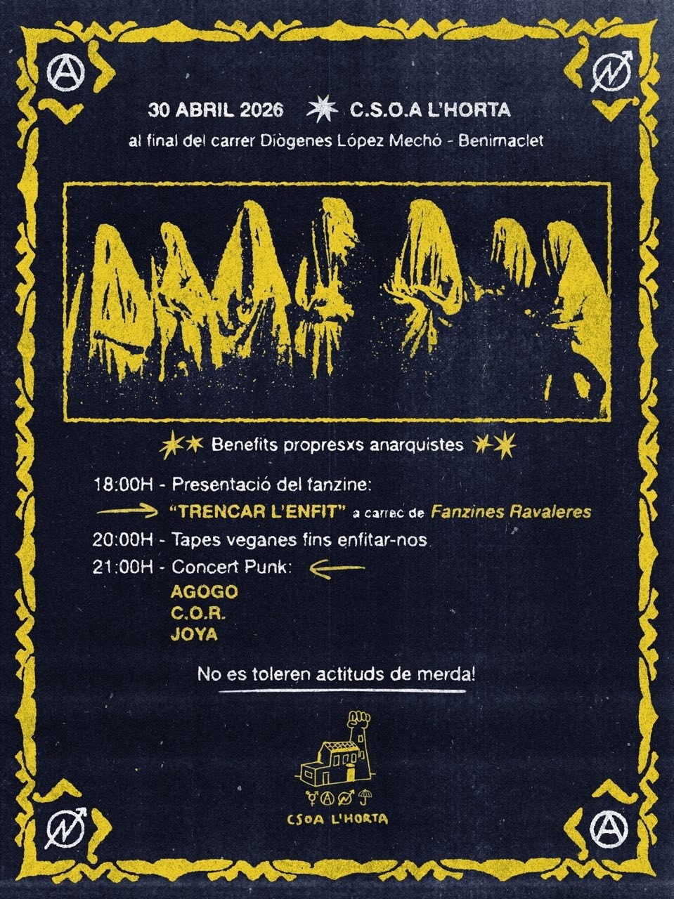 El 30 d’abril de 2026 el CSOA L’Horta acull una jornada autogestionada amb presentació de fanzine, tapes veganes i concert punk.