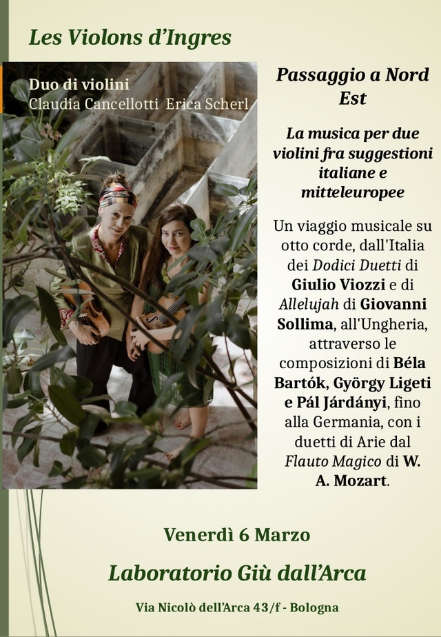 La musica per due violini fra suggestioni italiane e mitteleuropee Un viaggio musicale su otto corde, che ci conduce, dall'Italia dei Dodici Duetti del compositore triestino Giulio Viozzi e di Allelujah del violoncellista e compositore siciliano Giovanni Sollima, all'Ungheria, attraverso i ritmi Aksak delle composizioni di Béla