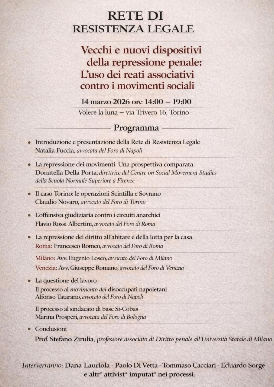 coordinarsi e a ragionare collettivamente su come opporsi all’attuale torsione autoritaria in ambito giudiziario, soprattutto in riferimento ai processi legati alla conflittualitΓ  e alla protesta sociale.