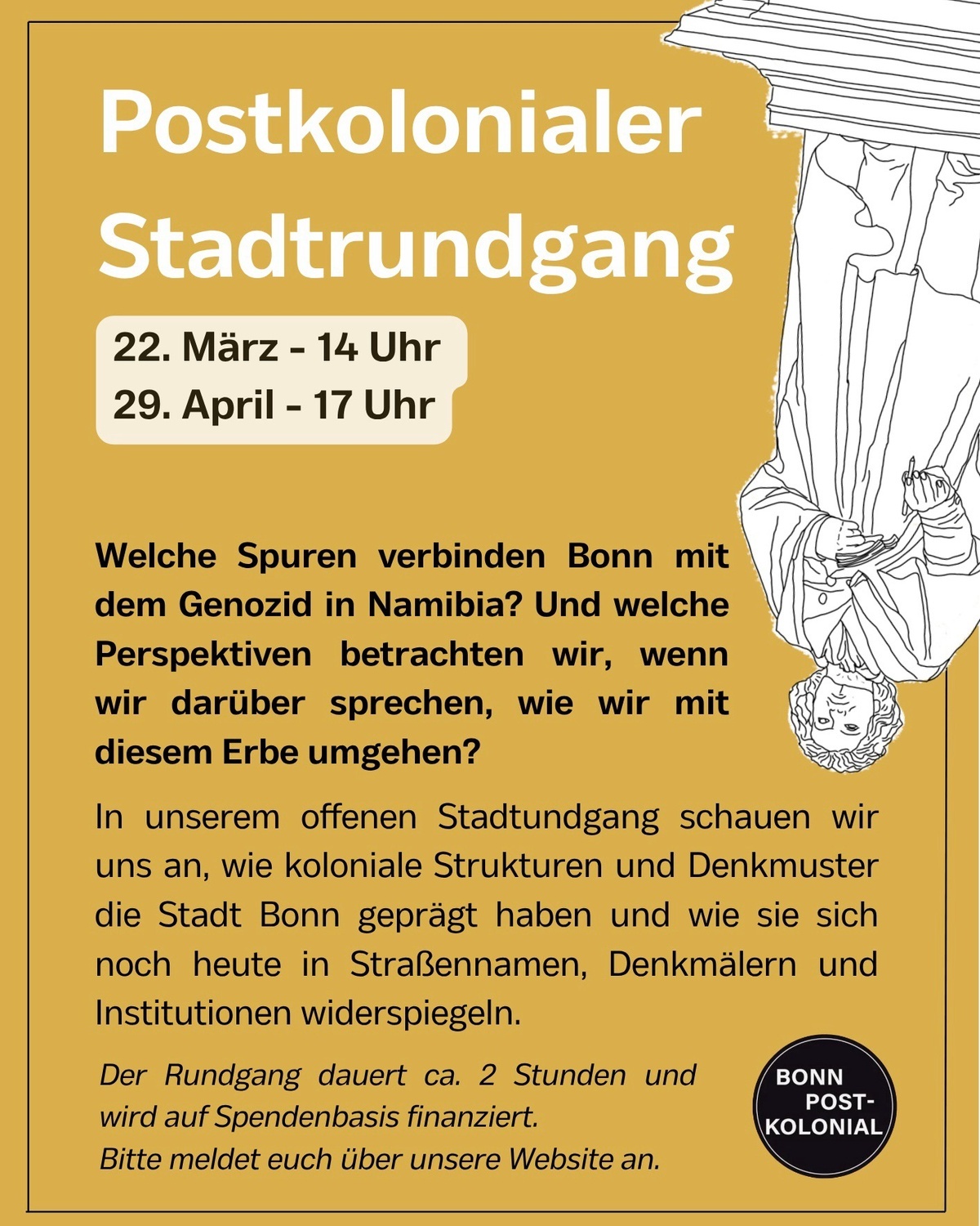 Gemeinsam gehen wir wieder zum Frühlingsbeginn durch Bonn – und bekommen dabei einen Einblick, wie das Stadtbild und das Leben in Bonn mit dem Kolonialismus verwoben sind. Es wird viel Raum für Fragen geben und wir wollen darüber diskutieren, warum wir eigentlich so wenig darüber wissen und wie heute mit dem Erbe kolonialer Gewalt umgegangen wird.