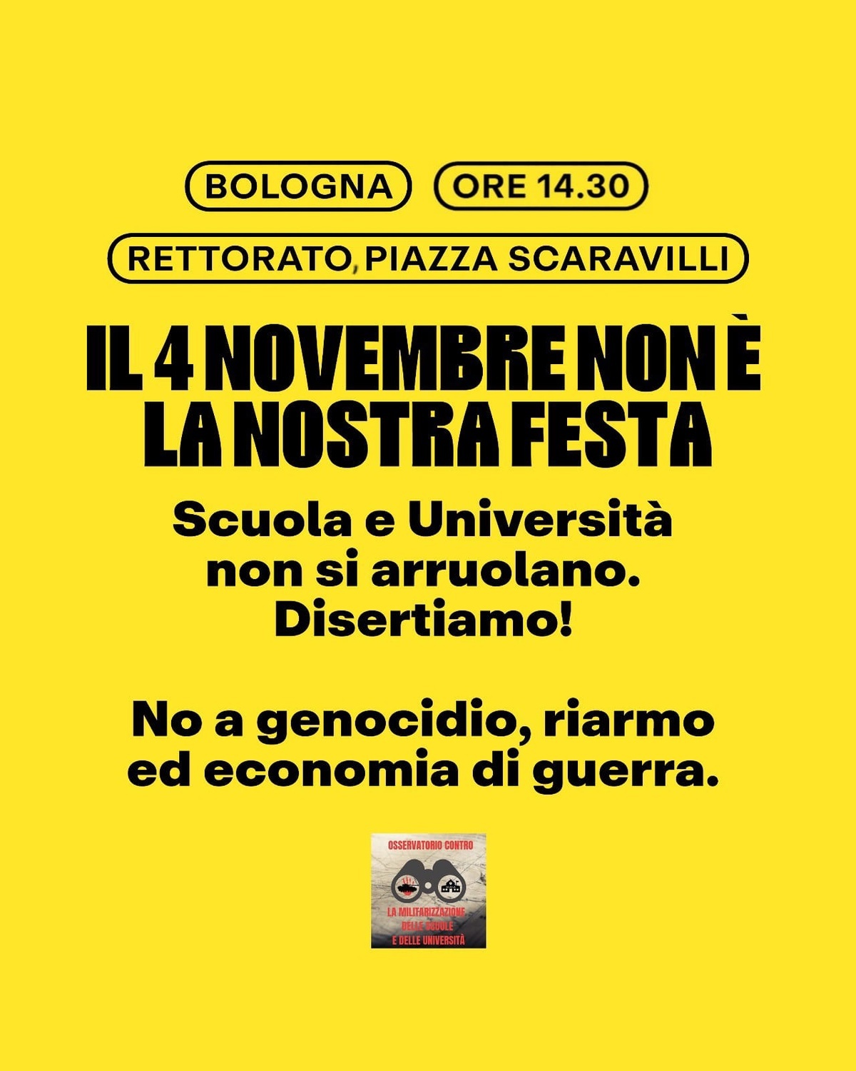 Il 4 Novembre non é la nostra festa .Scuola e Università non si arruolano .Disertiamo. No a genocidio,riarmo ed economia di guerra . Osservatorio contro la militarizzazione delle scuole e delle università