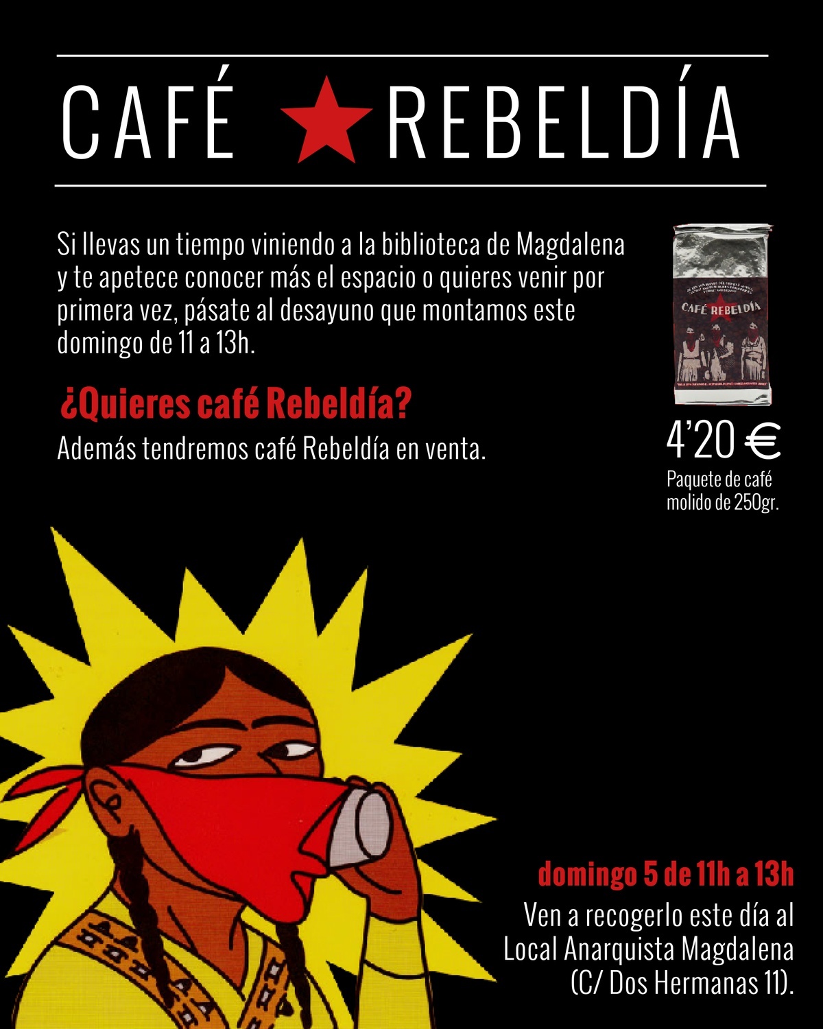 Si todavía no has pasado por el local, es una buena oportunidad para conocerlo (tenemos una biblioteca, espacio para asambleas, radio, propaganda…) y si sueles venir a por libros, vente a pasar un rato con nosotrxs desayunando café y bizcochos.