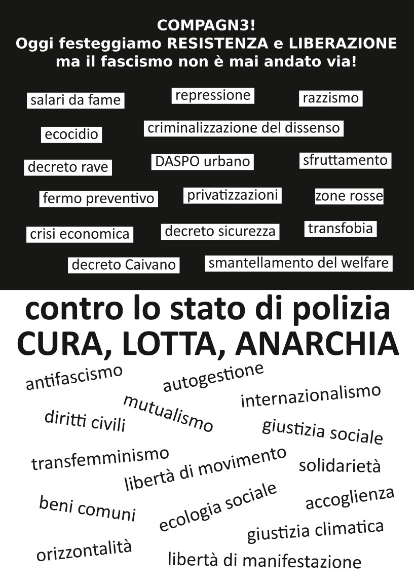 Sabato 25 Aprile: Contro lo stato di polizia. CURA, LOTTA ANARCHIA