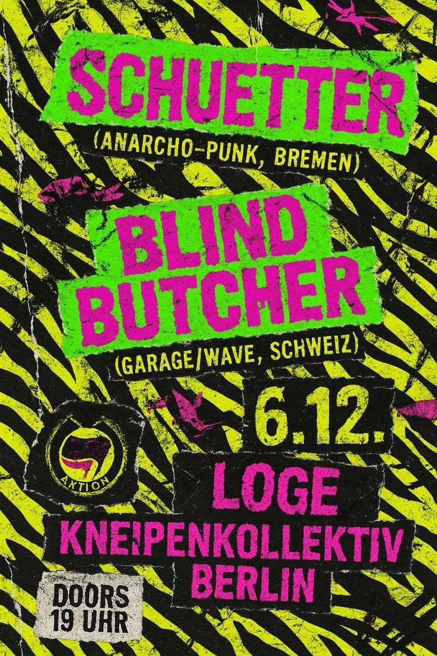 Shuetter (Anarcho-Punk, Bremen) und Blind Butcher (Garage/Wave-Pop, Schweiz) bringen die Loge zum Beben. Neonlichter, kaltes Bier und jede Menge Chaos – der perfekte Abend für Freund*innen des gepflegten Lärms.