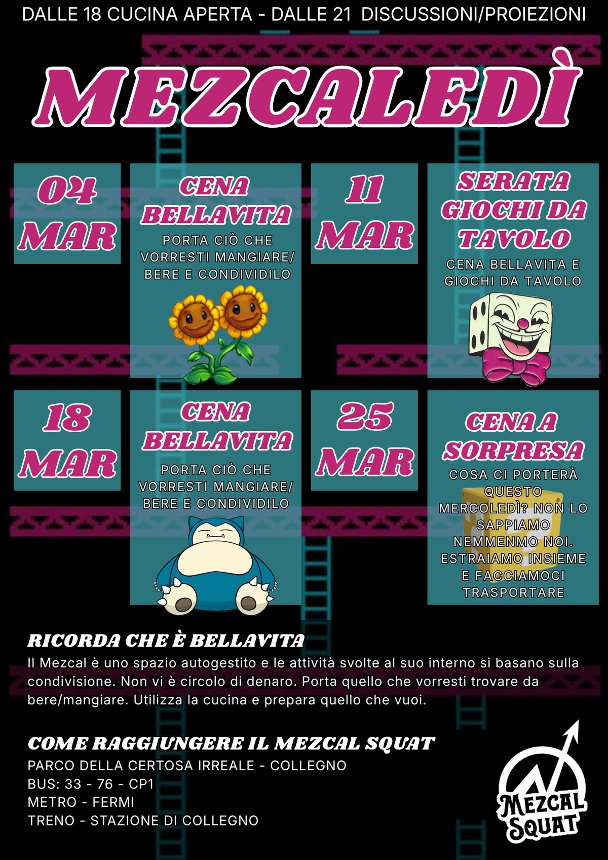 Il Mezcal Squat è uno spazio autogestito e le attività svolte al suo interno si basano sulla condivisione. Non vi è circolo di denaro. Porta quello che vorresti trovare. Utilizza la cucina e prepara quello che vuoi da mangiare.