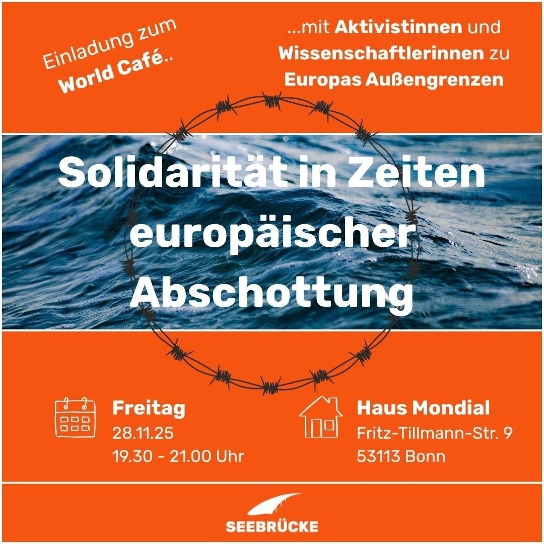 Über diese und weitere Fragen möchten wir als Seebrücke Bonn mit euch ins Gespräch kommen – beim World Café am 28. November 2025 um 19:30 Uhr im Haus Mondial in Bonn (ohne Anmeldung).