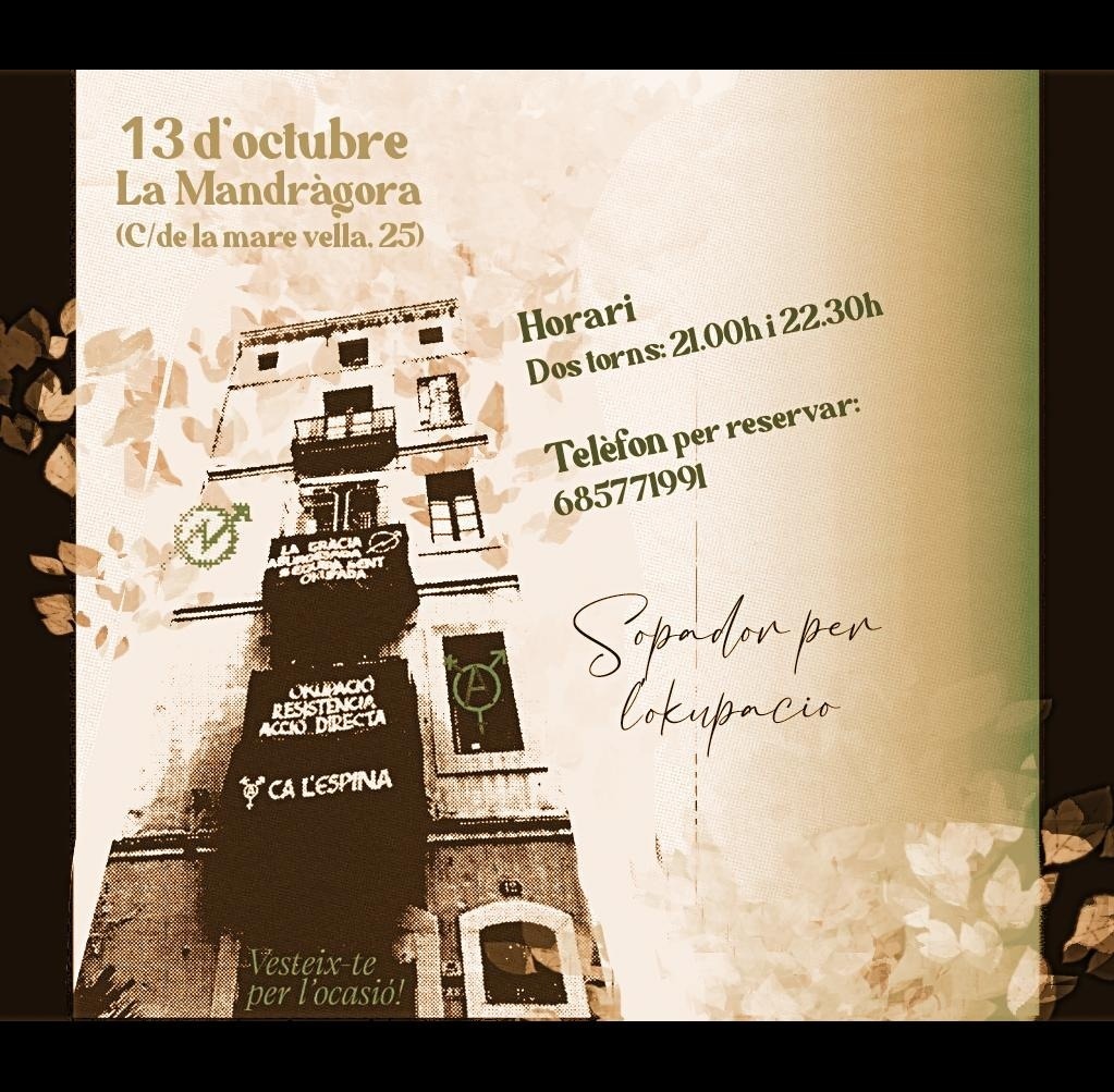 Comença la setmana compartint sopeta amb lis amiguis, la família o amb tu mateixa, i col·labora amb les okupes de la ciutat. Perquè de vegades aportar vol dir vindre a gaudir del sopar i omplir la panxa, vos esperem.
