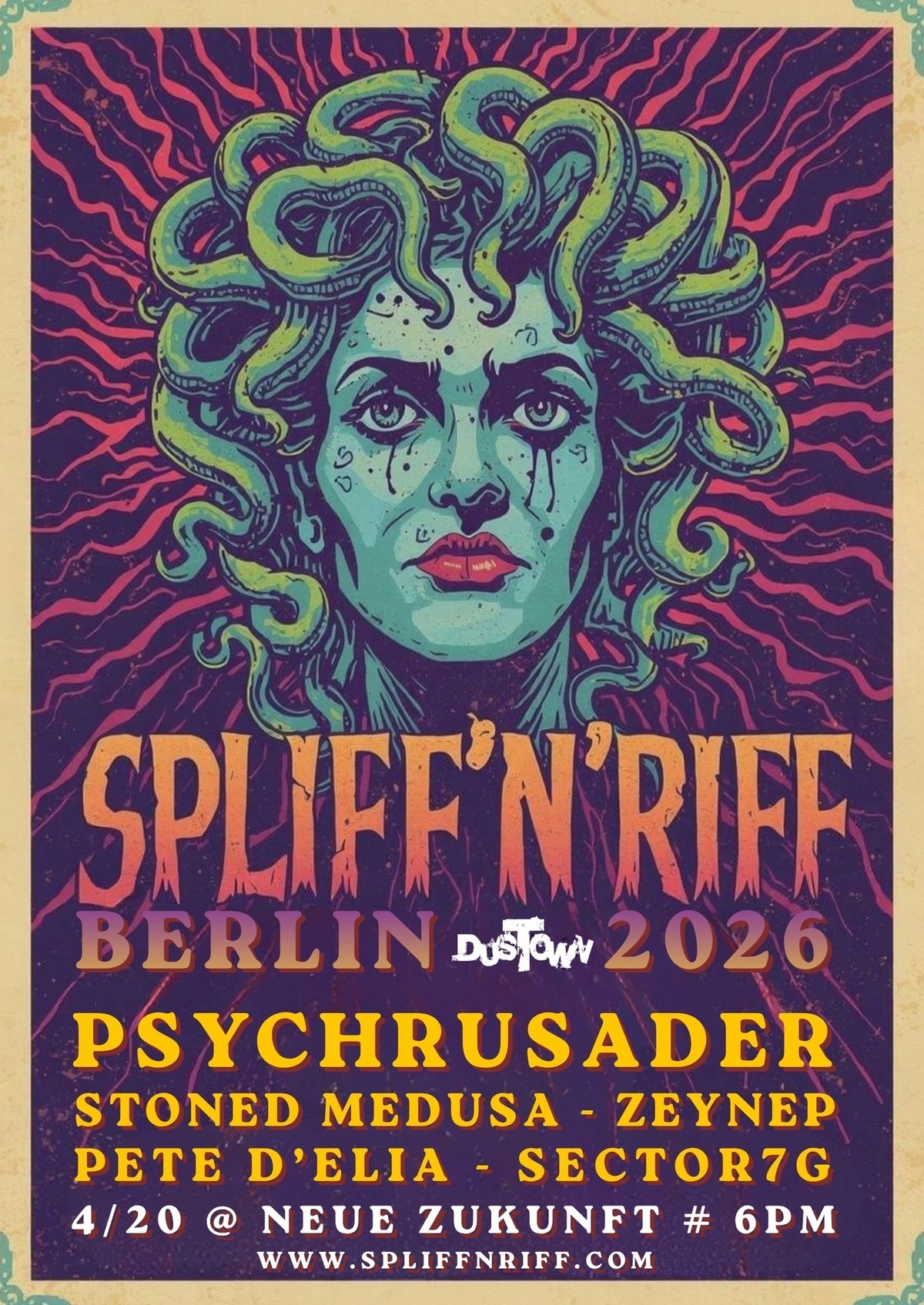 Berlin's annual Psych'delicious Stoneriffic Hardrockin' gathering to honor 420. In 2026 it will go down again at Neue Zukunft, close to Ostkreuz. 3 heavy bands, 1 happy banjo-män and psychedelic visuals will take you higher!