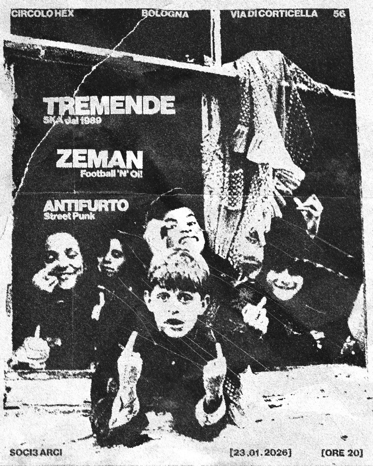 Gli Zeman sono una band Oi! di Bologna (e non solo!), attiva da piรน di dieci anni. Noti per il sound energico che mescola influenze hardcore e per i testi che riflettono una visione schietta e sfrontata della realtร , celebrano lo spirito DIY e la cultura punk/Oi!, con riferimenti al calcio e alla vita di strada che... "Ancor Non M'Abbandona!".