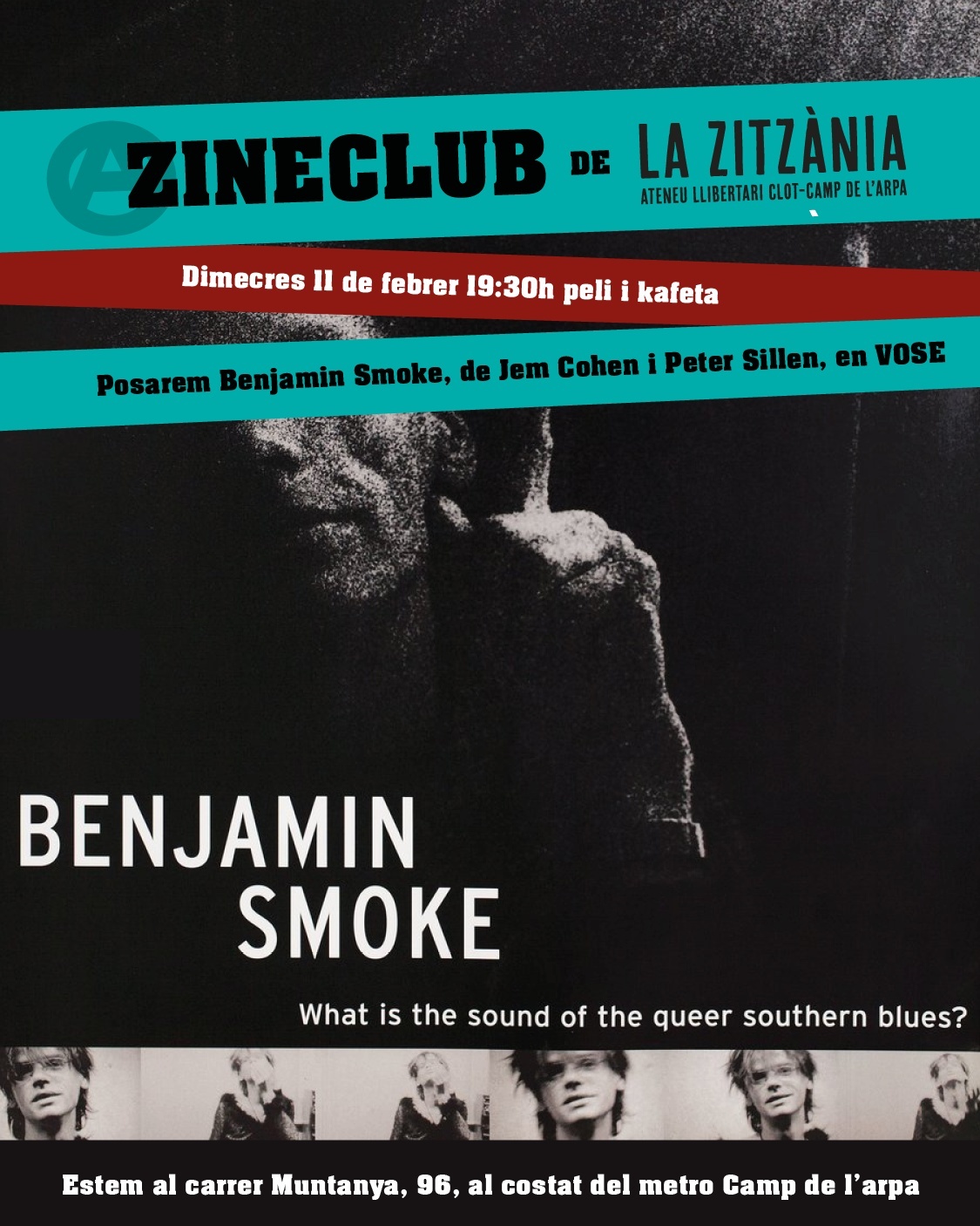 El Zineclub Zitzania presenta el documental Bejamin Smoke en VOSC. És un documental dels directors Jem Cohen i Peter Sillen sobre el llegendari músic underground Benjamin Smoke. El docu segueix el camí tortuós d'aquest habitant marginal, militant queer radical, fanàtic de l'speed, drag queen ocasional i renegat en tots els sentits que viu al barri amagat d'Atlanta anomenat "Cabbagetown" i toca amb la seva banda Smoke.