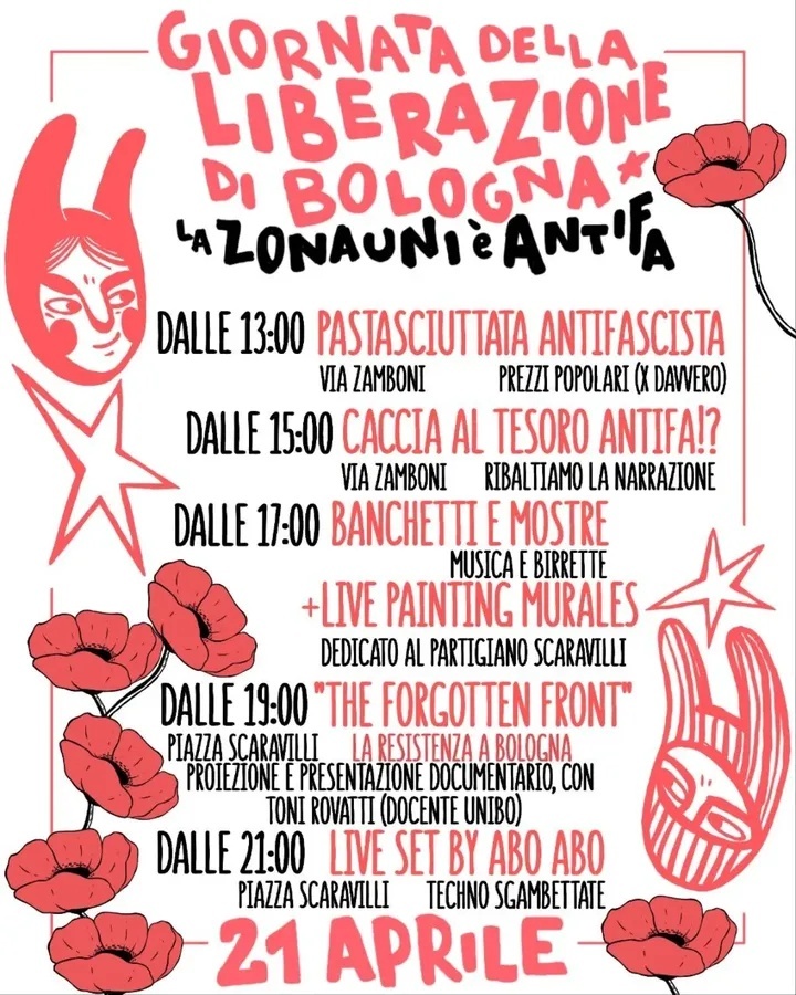 Nella giornata della liberazione di Bologna scegliamo di riempire le strade e le piazze della zona universitaria, perché vogliamo continuare a riappropriarci dei luoghi che attraversiamo ogni giorno per liberarli dalle logiche securitarie e guerrafondaie, perché essere antifasciste per noi oggi vuol dire continuare a lottare per una vita bella per tutt3